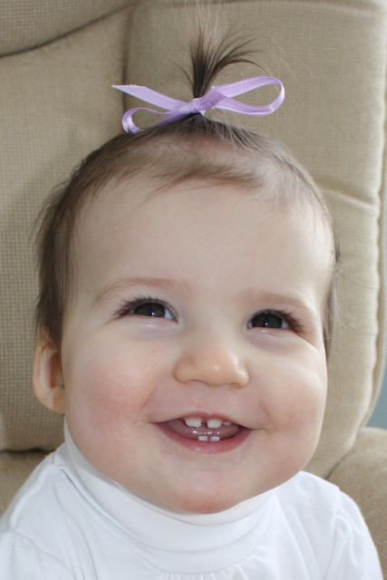 ...eats lots of new foods and is still nursing. Here are the new ones (all pureed or mashed): plain yogurt, peas, green beans, oatmeal cereal, pears, carrots. She also likes baby Puffs; they dissolve on her tongue and she mashes them with her gums. She's starting to get the hang of bringing them to her mouth and I love to watch her little tongue move them around in her mouth. If she only gets it halfway in, her little lips clench tight so she doesn't drop it and I've been trying to teach her to use her fist to push it in. So cute! She nurses 4 times a day (breakfast, lunch, supper, and bedtime) and she eats solid food 3 times a day. She cut one more tooth (her left "lateral incisor") so she has 5 total. She knows when I'm going to feed her because she watches me get out her sippy cup (she's started to suck on them now, not just chew them) and starts to get all excited (and mad if I don't put her in the highchair soon enough!). She'll let us know when Daddy prays too long at dinner time too because she wants to eat!!
