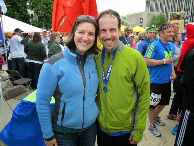 It was a pretty cold morning for the Riverbank Run this year. I was lucky to be able to watch Derek sans kids this year. It was just too cold and rainy to take the kids on the 5K walk so they stayed with Grandma. It was nice to have a "date".